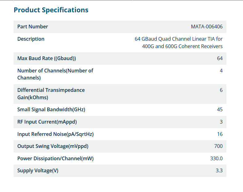 MACOM MATA-006406-DIEPPR 64GBaud 四路線性 TIA 芯片 適用于 400G/600G 相干
